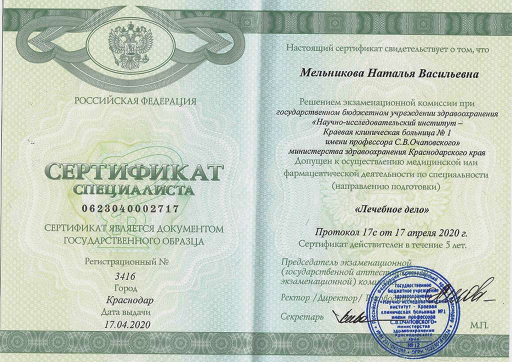 - Сертификат специалиста - 2020 - Научно-исследовательский институт — Краевая клиническая больница №1 имени профессора С.В. Очаповского
